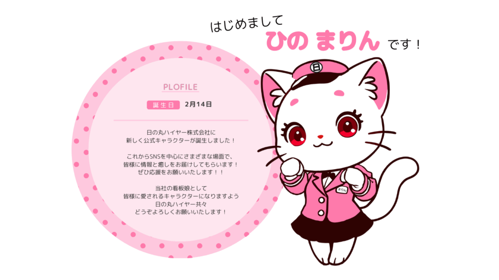 公式キャラクターが誕生しました 2025年6月22日 最終更新日時 : 2025年9月22日 hinomaru-hire日の丸ハイヤー株式会社に公式キャラクターの「ひの まりん」が誕生したことをお知らせします。皆様より深く愛され、親しみをもっていただける存在になることを目指します。\ 最新情報をチェック /