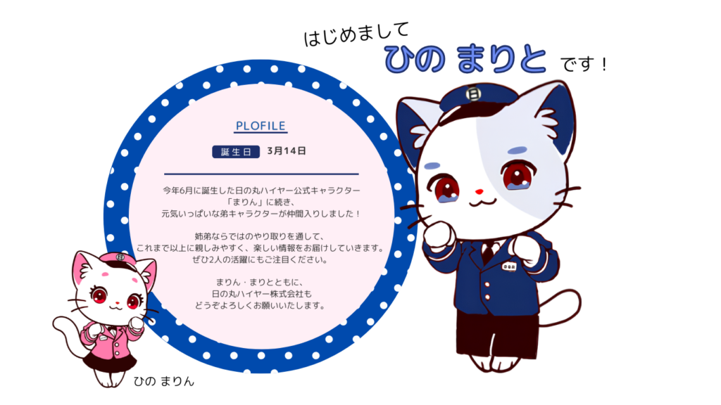 公式キャラクターの「ひの まりん」に弟が誕生しました 2025年12月19日 最終更新日時 : 2025年12月22日 hinomaru-hire日の丸ハイヤー株式会社に公式キャラクターの「ひの まりん」が誕生したことをお知らせします。皆様より深く愛され、親しみをもっていただける存在になることを目指します。